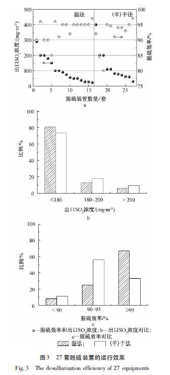 出口SO2濃度也是考核脫硫裝置運行效果的重要指標,尤其是入口SO2濃度較高的情況。為此本文考察了國內25家鋼鐵企業投運的27套脫硫裝置的運行效果[3-25],包括脫硫效率和出口SO2濃度兩個方面,結果見圖3,其中“(半)干法”包括半干法和干法。
